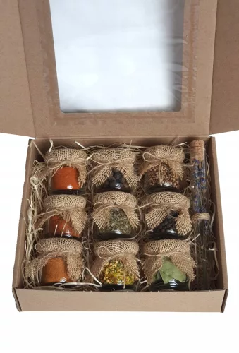 Prezentujemy wyjątkowy zestaw prezentowy, stworzony osobiście przez naszych specjalistów. Zestaw składa się z eleganckiego pudełka z okienkiem, wypełnionego drewnianymi wiórkami. W środku znajduje się kolekcja naszych najlepszych przypraw, zamkniętych w szklanych słoiczkach o pojemności 40 ml.