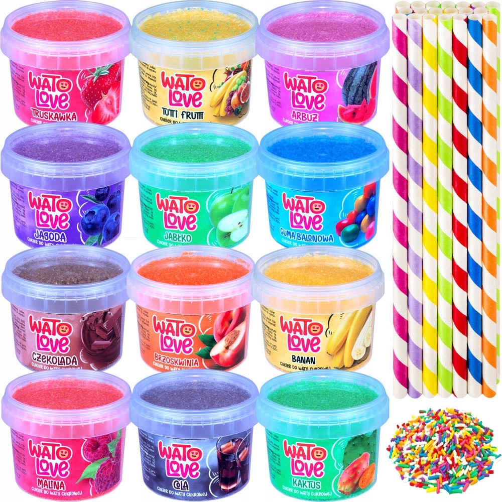 Z zestawu 12 kolorowych i smakowych cukrów Wato Love przygotujesz w domu profesjonalną watę cukrową. Każdy smak jest zapakowany po 100g w hermetycznie zamknięte pojemniki.