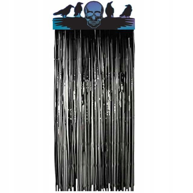 Mroczna, metaliczna zasłona na drzwi w halloweenowym klimacie, przyozdobiona listewką z czarnymi krukami i czaszką. Ciekawy gadżet dekoracyjny do zrobienia ścianki selfie, do przykrycia brzydkiego tła za ładnym stołem lub po prostu do zasłonięcia Twojej otwartej kuchni na domówce. Doskonale sprawdzi się na imprezie karnawałowej.