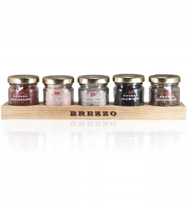 To pudełko 5 soli Brezzo może być oryginalnym pomysłem na prezent, zawierającym 5 różnych rodzajów soli: sól hawajską, sól himalajską, sól cypryjską, sól perską niebieską i sól wędzoną.