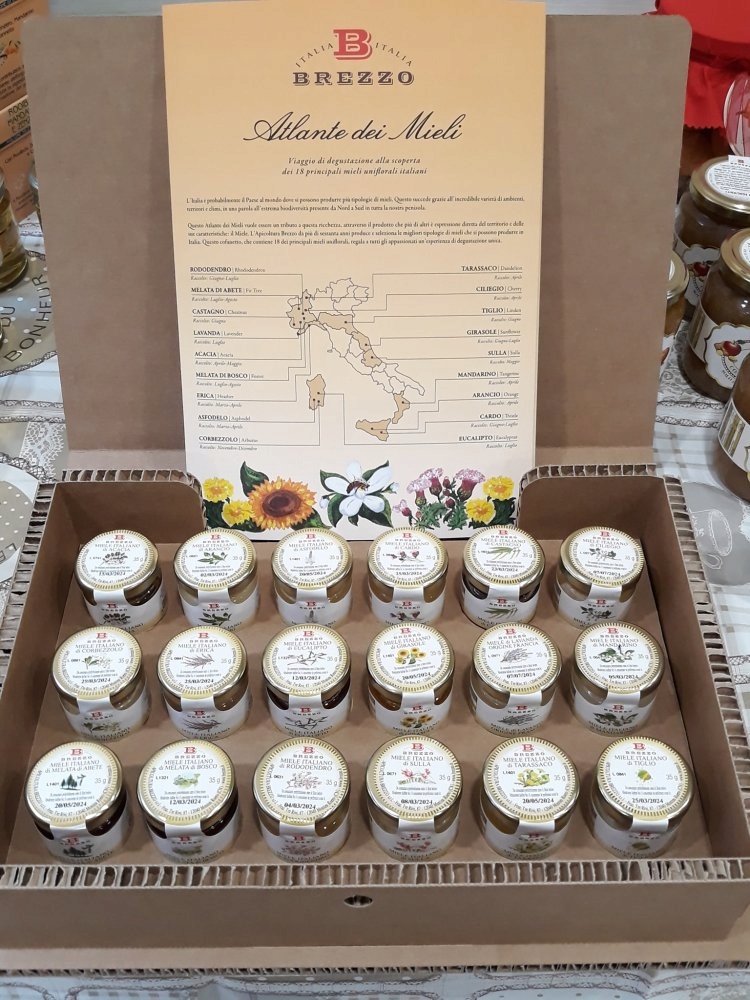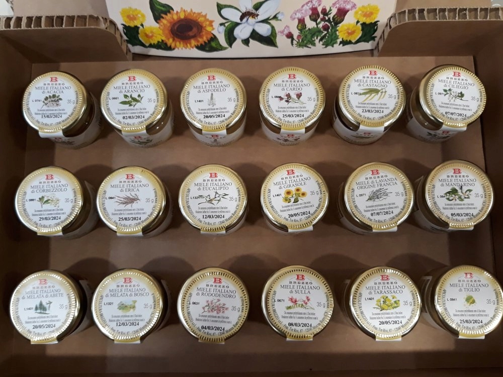 Box zawiera asortyment włoski miód: akacja, pomarańcza, asfodel, oset, kasztanowiec, wiśnia, planika, wrzos, eukaliptus, słonecznik, jodła, miód leśny, rododendron, kopysznik, mniszek lekarski, lipa, mandarynka i lawenda.