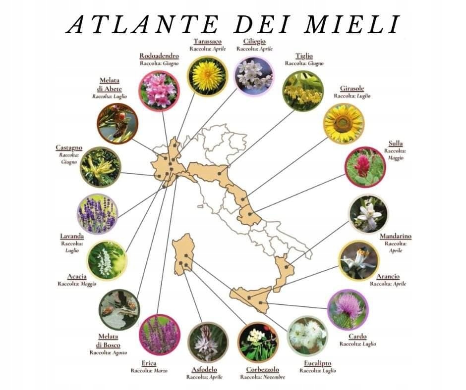 • Skład: włoski miód (akacja, pomarańcza, asfodel, oset, kasztanowiec, wiśnia, planika, wrzos, eukaliptus, słonecznik, jodła, miód leśny, rododendron, kopyszny, mniszek lekarski, lipa, mandarynka i lawenda)