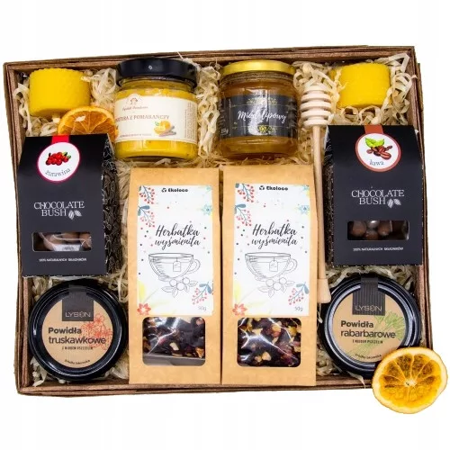 • W koszyku znajduje się ozdobna wełna drzewna, która zabezpiecza produkty przed zbiciem oraz suszone cytrusy dla ozdoby