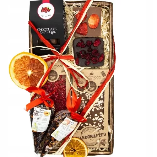 • Wszystkie produkty znajdują się w ręcznie wykonanym koszyku z certyfikowanego (FSC) drewna 35x18x9 cm