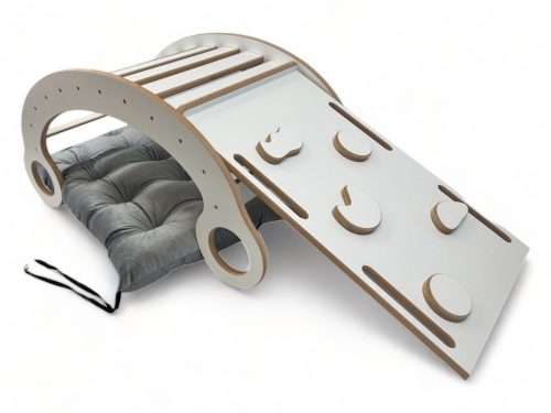 Drewniany Bujak Montessori + Zjeżdżalnia + Ścianka wspinaczkowa + Poduszka Szara - wszechstronna, kreatywna zabawka dla Twojego dziecka