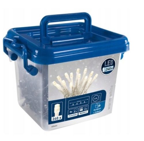 Łańcuch wyposażony jest w 6-godzinny timer i 240 diod LED, które imponują ekonomiczną i przyjazną dla środowiska technologią. Charakteryzują się niskim wydzielaniem ciepła, niskim zużyciem energii i długą żywotnością. Możesz wybrać pomiędzy ośmioma różnymi funkcjami migania - od szybkiego do wolnego. Dzięki wbudowanemu układowi pamięci łańcuch świetlny świeci w wybranym wcześniej trybie nawet po wyłączeniu i włączeniu. Barwa światła jest ciepłobiała, a tym samym zapewnia nieco więcej przytulności. Plastikowe pudełko służy do praktycznego przechowywania.