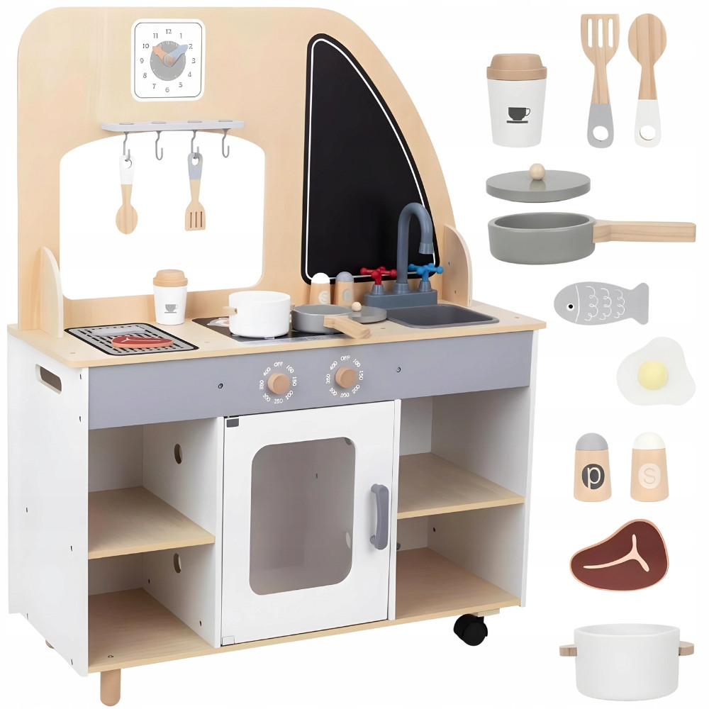 • Zestaw zawiera: Drewniany food truck z kółkami i okienkiem do przyjmowania zamówień, Zlew, ruchomy kran z obracającymi się kurkami, garnek, patelnia i przykrywka, przybory kuchenne: łyżka i łopatka do przewracania, kubek do kawy z przykrywką, jedzenie: jajko sadzone, ryba i mięso, 2 pojemniki z przyprawami: pieprz i sól, 4 haczyki do wieszania przyborów kuchennych, zegar z ruchomymi wskazówkami, nasz firmowy kalendarzyk