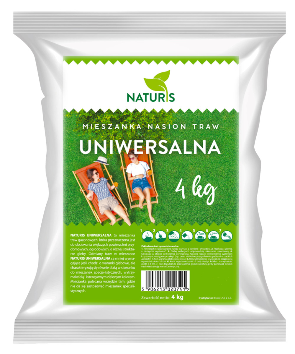 Naturis trawa uniwersalna to mieszanka traw gazonowych, która przeznaczona jest do obsiewania większych powierzchni przydomowych, ogrodowych, o różnej strukturze gleby.