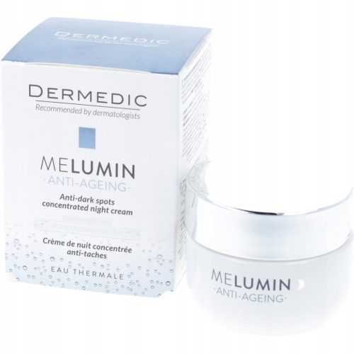 • DERMEDIC MELUMIN DEPIGMENTING Krem koncentrat przeciw przebarwieniom na noc w intensywny sposób rozjaśnia przebarwienia, plamy i nierówności kolorystyczne skóry oraz zapobiega powstawaniu nowych pobudzając jednocześnie proces odnowy naskórka.