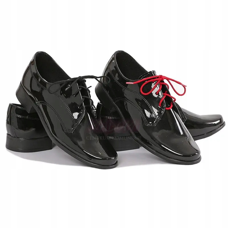 Obuwie komunijne czarne lakierki dla chłopca Polskiego Producenta obuwia firmy MIKO wykonane z ekologicznej skóry, wkładka ze skórki naturalnej. Buty sznurowane, sznurówki dołączone do obuwia w kolorze czarnym i czerwonym. Z przodu lekkie zaokrąglenia.