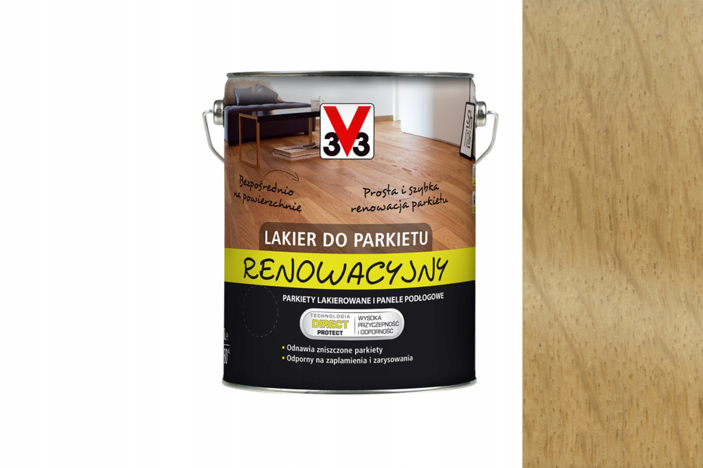 • Dzięki technologii DIRECT PROTECT, akrylowy lakier renowacyjny do parkietu V33 można nakładać bezpośrednio na odnawianą powierzchnię. W prosty sposób pozwala on odnowić parkiety lakierowane oraz panele podłogowe.