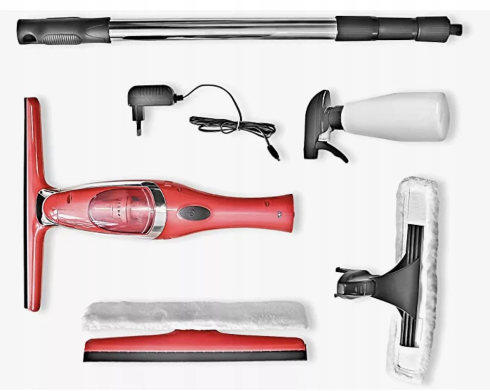 Akumulatorowy odkurzacz okienny, ładowarka, butelka z rozpylaczem + nasadka do mopa, głowica dyszy, głowica z gumową wargą, szybka wymiana podwójna głowica z nakładką z mikrofibry i gumową wargą, 2-stopniowa regulacja uchwytu przedłużającego 500-1200 mm.