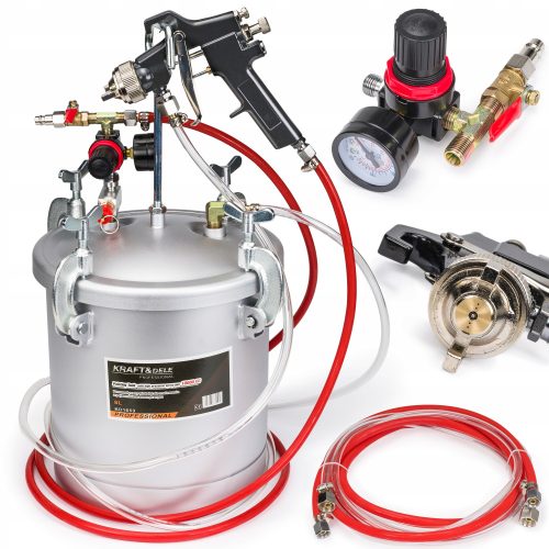 Zestaw posiada 8 l zbiornik wykonany z aluminium, na pokrywie którego mocowany jest reduktor ciśnienia, z manometrem i zaworem bezpieczeństwa. Do pistoletu lakierniczego farba podawana jest pod ciśnieniem i tam rozpylana jest przy pomocy sprężonego powietrza.Ciśnieniowy agregat malarski idealnie sprawdzi się przy malowaniu dużych powierzchni i nie tylko.