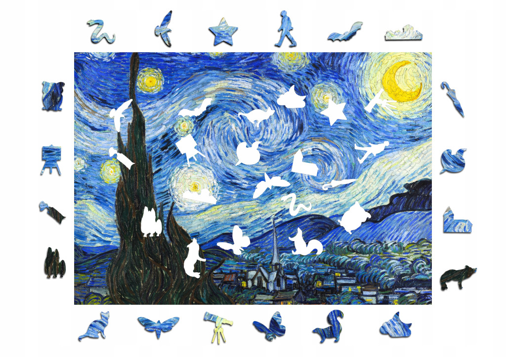 Przepiękne drewniane puzzle przedstawiające obraz Vincenta van Gogha  "Gwiaździsta noc"".