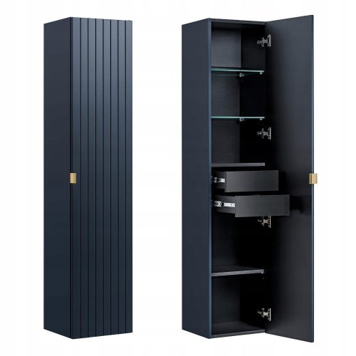 Głęboki granat połączony z ryflowanymi frontami nadaje całości nietuzinkowego charakteru, dzięki czemu wygląd kolekcji sprosta nawet najbardziej wysublimowanym potrzebom wizualnym. Dopełnieniem kolekcji są złote uchwyty, doskonale wpisujące się w obecne trendy. Luksusowy design i odważna kolorystyka- tak można opisać Santa Fe Deep Blue. Niebanalna estetyka nie ustępuje miejsca najwyższej precyzji wykonania i funkcjonalności mebli łazienkowych z tej serii. .