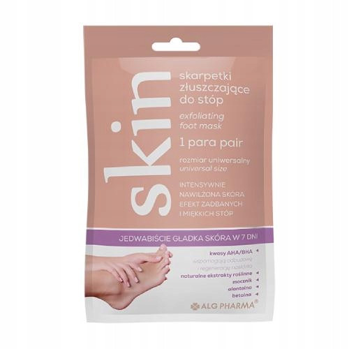 SKIN skarpetki złuszczające, wyselekcjonowana kompozycja z aktywnie działającym płynem, delikatnie usuwa zrogowacenia czego efektem są wypielęgnowane i aksamitne miękkie stopy. Innowacyjna skarpetka pozwala pominąć pracochłonne i trudne usuwanie zrogowaceń za pomocą przyrządów do pielęgnacji stóp. Aktywnie działający płyn zawierający kwasy AHA i BHA działają keratolitycznie, zmiękcz naskórek oraz zapewnia skuteczną odbudowę zniszczonej skóry stóp. Regenerację i nawilżenie zapewniają mocznik, alantoina i betaina, dzięki czemu skóra stóp po zabiegu jest miękka i gładka. W odnowie naskórka pomagają zawarte w produkcie ekstrakty roślinne z cytryny, ananasa, marakui, gruszki, winogrona, opuncji i ekstrakt z miodu.
