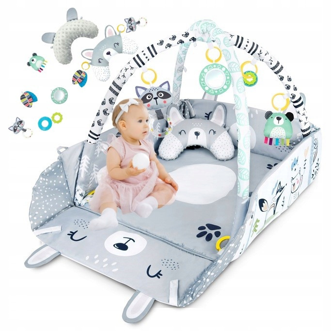 • zestaw zawiera: matę, 4 ścianki, 2 pałąki, 7 wielofunkcyjnych zabawek,