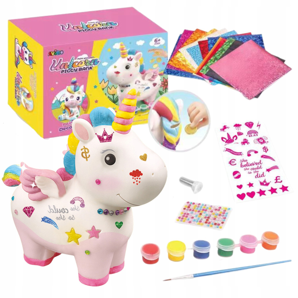 JEDNOROŻEC Skarbonka do MALOWANIA farbki pędzelek naklejki DIAMENTY PREZENT