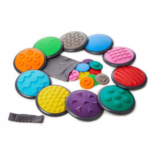 Sensoryczne dyski wykonane z przyjemnych w dotyku materiałów. Każdy z dysków posiada inny kolor i inną fakturę na swojej powierzchni. Dzieci mogą dotykać dysków rękoma i stopami jednocześnie rozwijając zdolność do rozpoznawania kształtów oraz opisywania wrażeń zmysłowych.
