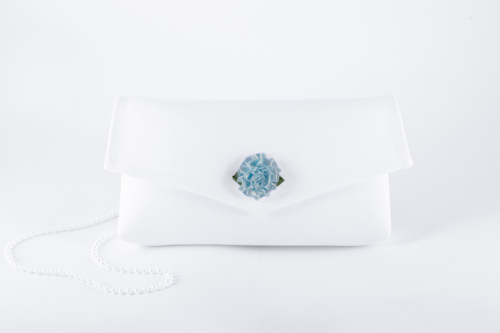 Torebka uszyta jest ze śnieżnobiałej tkaniny albowej, jest zapinana na rzep.