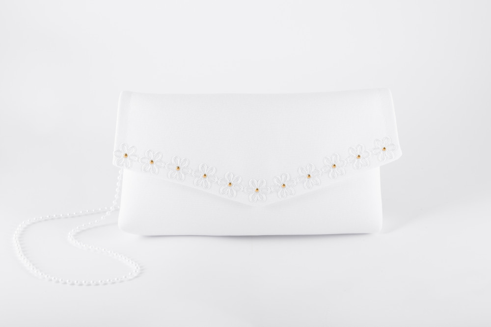 Torebka uszyta jest ze śnieżnobiałej tkaniny albowej, jest zapinana na rzep.