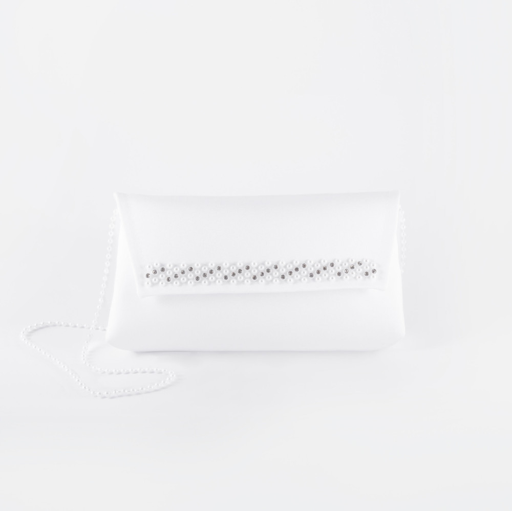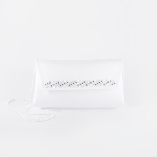 Torebka uszyta jest ze śnieżnobiałej tkaniny satynowej, jest zapinana na rzep.