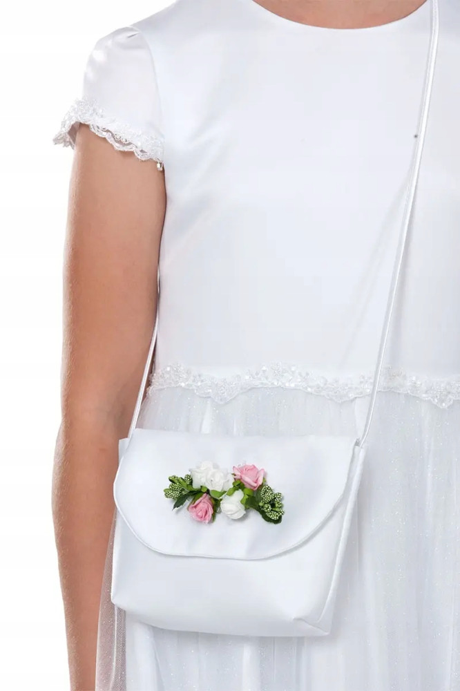 Torebka komunijna uszyta z białej satyny ślubnej na sznureczku atłasowym do przewieszenia przez ramię. Torebeczka jest gładka zdobiona białymi kwiatuszkami z zieloną gipsówką, od środka usztywniana przez co ładnie się prezentuje. Torebka zapinana na rzepa.