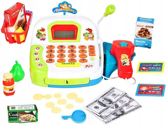 Niesamowity Zestaw do zabawy w sklep na baterie. Kasa posiada wyświetlacz oraz funkcje kalkulatora, z miękkimi gumowymi przyciskami Kasa fiskalna posiada wysuwaną szufladkę na pieniążki. Do kasy dołączony jest mikrofon oraz czytnik. Po naciśnięciu przycisku czytnika wydaje dźwięk. Mikrofon działa po naciśnięciu specjalnego przycisku.