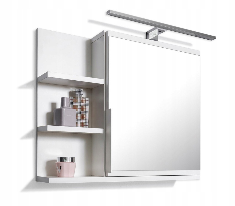 Modna i funkcjonalna biała szafka łazienkowa z lustrem, półkami i oświetleniem LED - LEWA