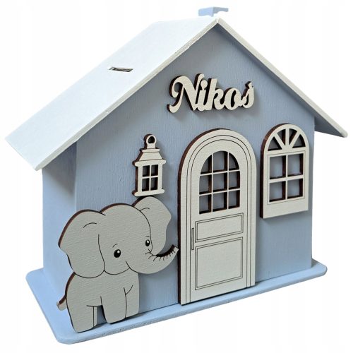 Prezentowana skarbonka jest w kolorze jasno niebieskim a jej dach pomalowany został na biały kolor.