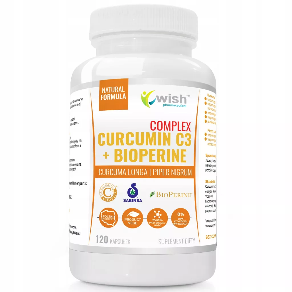 Jednakże zawartość kurkuminy w kurkumie jest bardzo mała i wynosi około 3% suchej masy kurkumy, dlatego właśnie Produkt marki Wish pharmaceutical® zawiera opatentowany complex: Curcumin C3 Complex® , który uzyskiwany jest z suszonych kłączy Curcuma longa (kurkumy) i standaryzowany na zawartość minimum 95% kurkuminoidów.