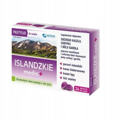 Wyrób medyczny Islandzkie medic + pastylki do ssania zawiera w swoim składzie roślinne ekstrakty: z porostu islandzkiego, malwy i lipy. Rośliny te bogate są w substancje śluzowe, które powlekają błonę śluzową jamy ustnej i gardła. Dodatkowo zawarty w wyrobie kwas hialuronowy wykazuje silne właściwości nawilżające. Dzięki temu wyrób może być stosowany w celu łagodzenia objawów suchego kaszlu, chrypki i bólu gardła.