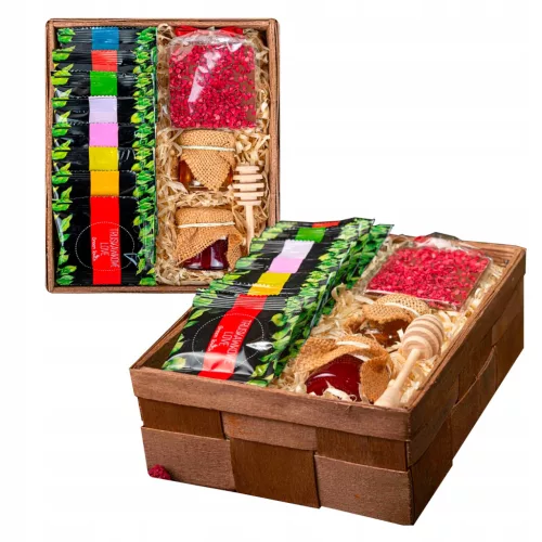 Kosz prezentowy zestaw herbat miód, konfitura czekolada