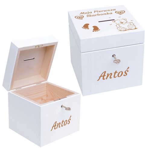• Drewnianą skarbonkę w białym kolorze wyposażoną w  ozdobny kluczyk,