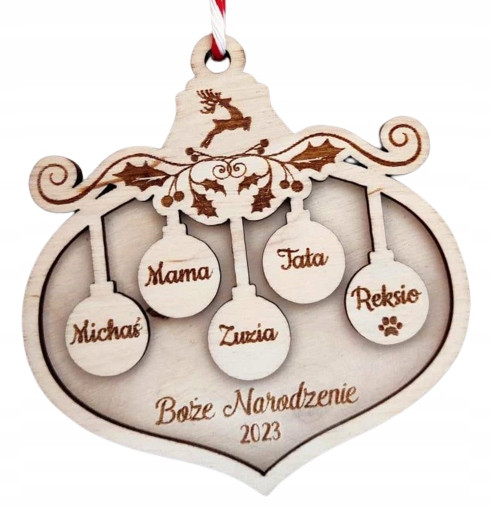 Piękna drewniana bombka z imionami rodziny. Taka bombka to piękna świąteczna dekoracja, a także świetny pomysł na prezent dla najbliższych.
