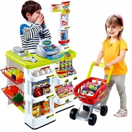 • W zestawie znajduje się także praktyczny wózek zakupowy, dzięki czemu dzieci mogą się wspólnie bawić w sklep i zamieniać rolami pomiędzy sprzedawcę i kupującego.