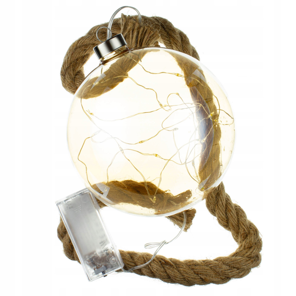Szklana bombka podświetlana diodami LED na jutowym sznurze - idelana dekoracja na czas Świąt Bożego Narodzenia. Jaj ciepłe swiatło stworzy w domu przytulną, wyjątkową atmosferę a jutowy gruby sznur dodaje jej eleganckiego nowoczesnego stylu. Może służyć jako ozdoba wiszca lub leżąca.