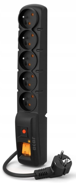 Acar F5 to najpopularniejsze urządzenie zabezpieczające z rodziny acar. Przy długości niespełna 33cm daje do dyspozycji pięć gniazd sieciowych z uziemieniem. Ilość ta, w większości zastosowań jest wystarczająca, a stosunkowo niewielkie rozmiary pozwalają na swobodne umieszczenie go nawet na biurku. Zastosowany bezpiecznik automatyczny pozwala nazwać go praktycznie bezobsługowym. Duża skuteczność działania predysponuje go do miana zabezpieczenia podstawowego, niezbędnego w każdym miejscu. Uchwyty do mocowania są opcjonalnie dostępne u dystrybutora.