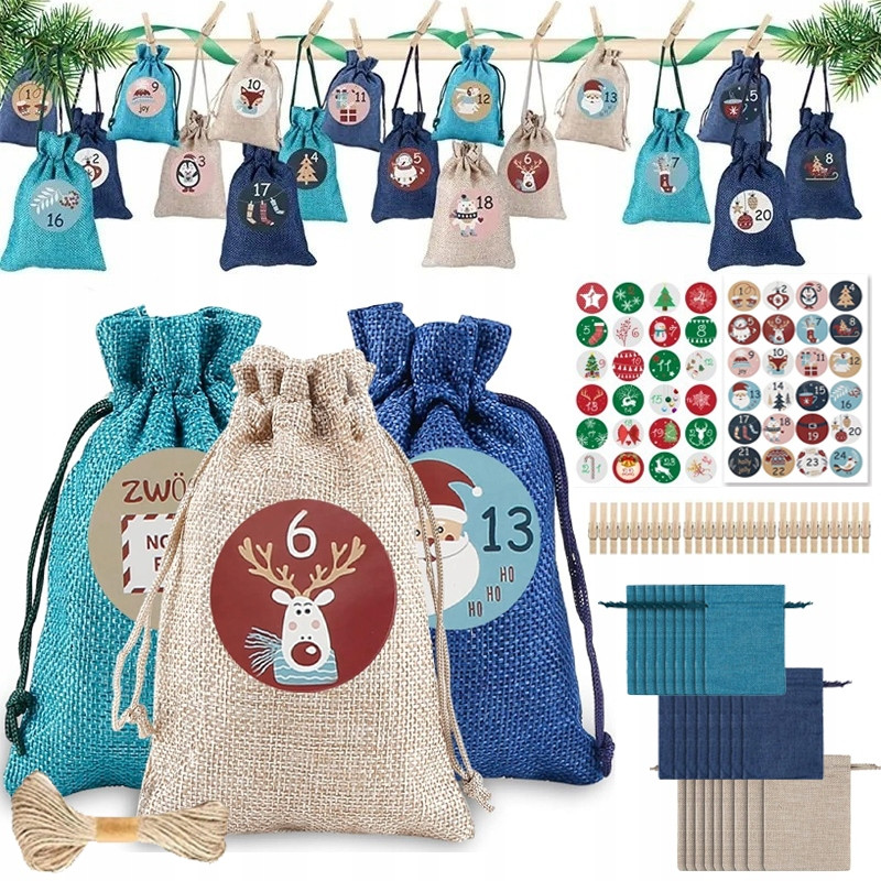 • 24 x woreczki adwentowe (8 x brązowe, 8 x zielone, 8 x niebieskie)