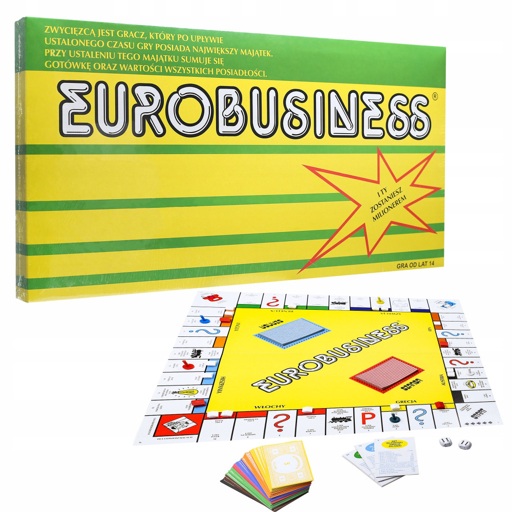 EuroBusiness to nie tylko gra planszowa, to wyzwanie, które dostarcza intensywnych emocji, zaskakujących zwrotów akcji i niepowtarzalnej zabawy. Z mądrymi inwestycjami, kupowaniem i sprzedawaniem nieruchomości oraz trafnymi ocenami sytuacji, możesz zdobyć majątek i zwycięstwo. Zagraj w EUROBIZNES i udowodnij, że masz nie tylko głowę do interesów, ale również talent do zostania milionerem. Gra przeznaczona dla 2-5 graczy, w wieku od 14 lat. Doświadcz jednej z najpopularniejszych gier towarzyskich na świecie i wejdź do ekscytującego świata finansów!