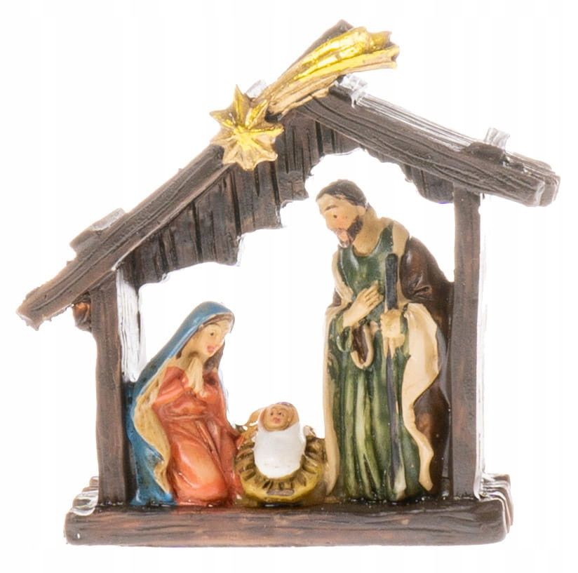 Szopka Bożonarodzeniowa mini - figurki przedstawiają Świętą Rodzinę-Najświętszą Maryję Pannę, Świętego Józefa, Dzieciątko Jezus, przed którymi widnieje gwiazda betlejemska. Całość ma wysokość 6 cm a składa się z jednego elementu. Pięknie wykonany z dbałością o szczegóły z masy ceramicznej (żywicy). Doskonale sprawdzi się jako dopełnienie świątecznego wystroju mieszkania lub dodatek do prezentu.