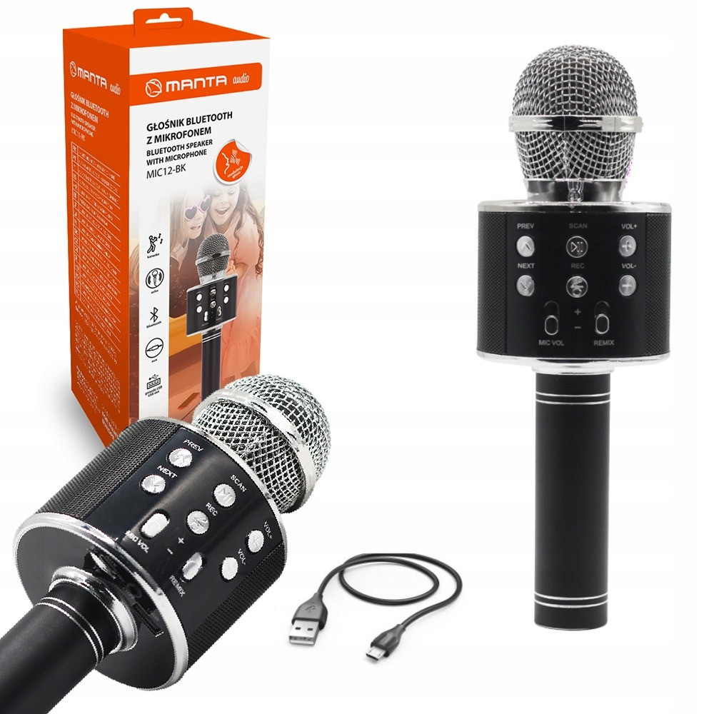 Czarny Mikrofon Bluetooth Karaoke z efektem echo i modulacją głosu LED Manta MIC12-BK