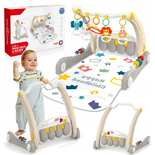 Wielofunkcyjna interaktywna zabawka, która łączy w sobie zalety maty edukacyjnej z kolorowymi zawieszkami i pianinkiem oraz pchacza do nauki stawiania pierwszych kroków.