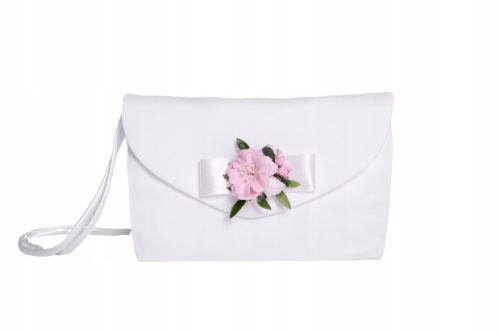 Torebka uszyta jest ze śnieżnobiałej tkaniny albowej, jest zapinana na rzep.