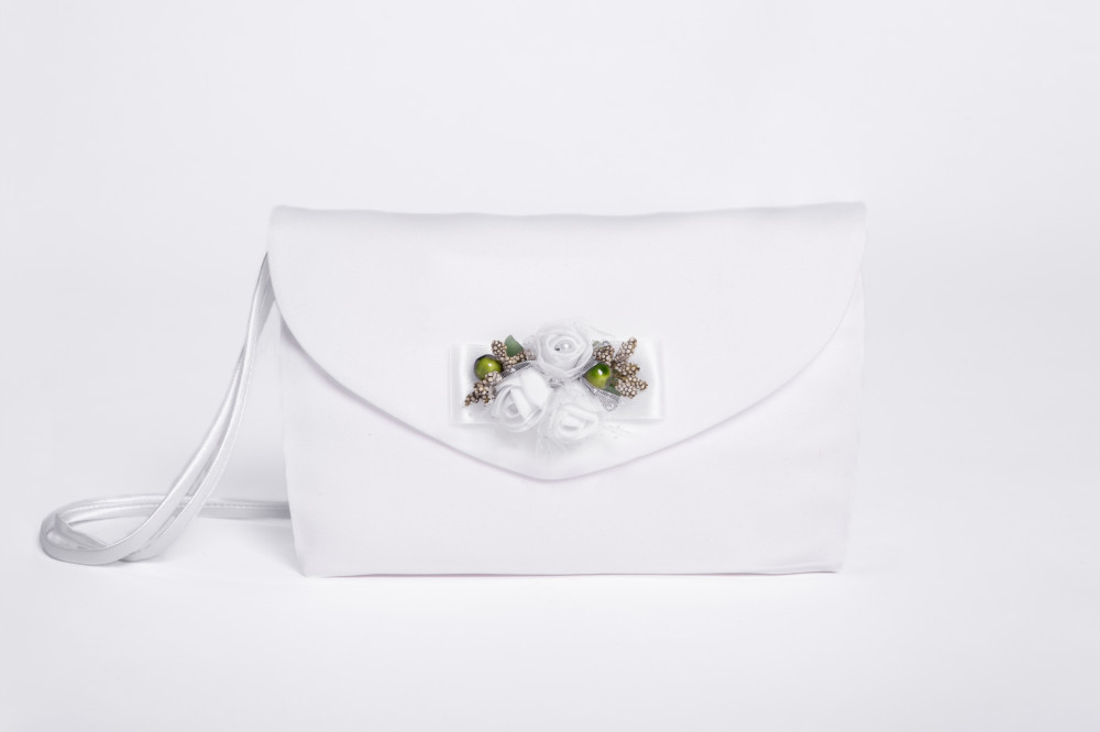 Torebka uszyta jest ze śnieżnobiałej półmatowej satyny, jest zapinana na rzep.