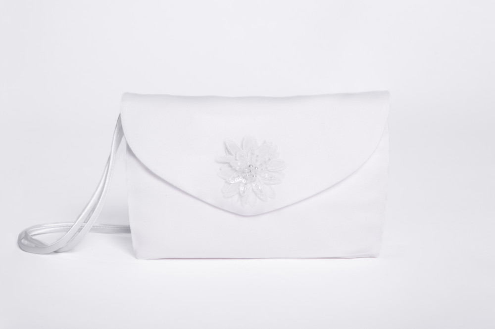 Torebka uszyta jest ze śnieżnobiałej półmatowej satyny, jest zapinana na rzep.