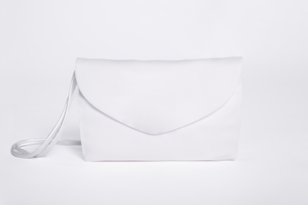 Torebka uszyta jest ze śnieżnobiałej półmatowej satyny, jest zapinana na rzep.