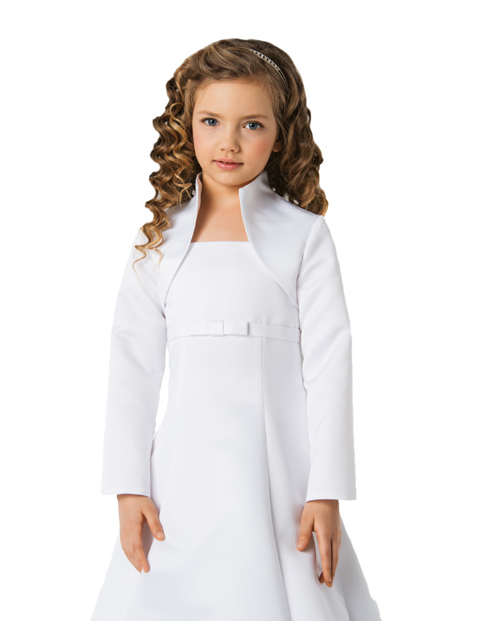 Mamy do zaoferowania Państwu nowe bolerko komunijne z długim rękawem, ze stójką. Wykonane jest bardzo starannie z atłasu, dostępne w kolorze białym.