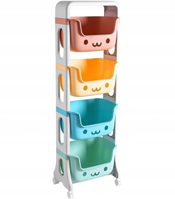 Kolorowy i praktyczny regał to doskonałe rozwiązanie, by utrzymać porządek w pokoju Twojego dziecka. Wyposażony w 4 pojemniki, regał pomieści mnóstwo zabawek. Dzięki kółkom z hamulcami, przesuwanie szafki staje się łatwiejsze. Pastelowe barwy regału doskonale komponują się z dziecięcym wnętrzem. Materiał elastycznego i trwałego tworzywa sztucznego zapewnia nie tylko estetykę, ale także funkcjonalność. Dodatkowo, łatwość utrzymania czystości sprawia, że regał z łatwością można czyścić wilgotną ściereczką.
