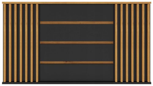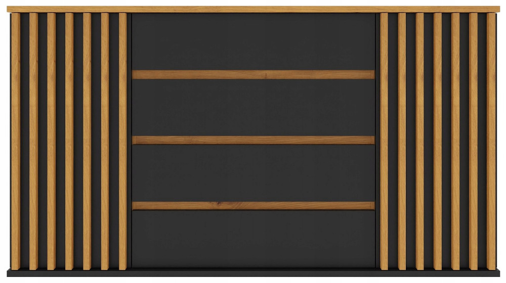Komoda NELGARI jest propozycją wykonaną w ponadczasowej oraz nietuzinkowej stylistyce dzięki której doskonale sprawdza się zarówno w loftowych, jak i nowoczesnych aranżacjach pomieszczeń. Komoda została wyposażona w drzwi z lamelami po lewej i prawej stronie, gdzie za każdymi z nich znajduje się półka. Natomiast w centralnej części komody swoje miejsce znalazły cztery szuflady umieszczone na prowadnicach kulkowych z bezuchwytowym systemem otwierania. Dodatkowo lamele w drzwiach zostały dodatkowo wzmocnione na pomocą wkrętów, dzięki czemu mogą służyć jako uchwyty.